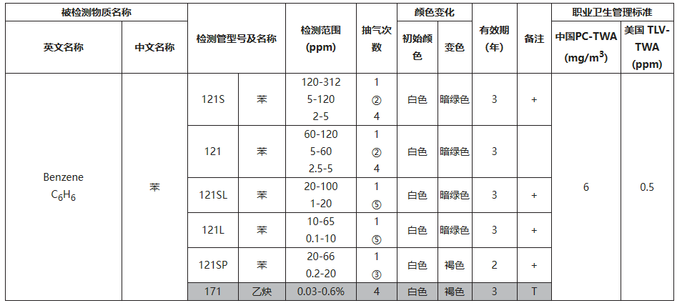 T:温度修正 H:湿度修正 +:双管 ++:9 支检测管 * :冷藏保存