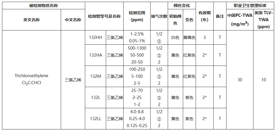 T:温度修正 H:湿度修正 +:双管 ++:9 支检测管 * :冷藏保存