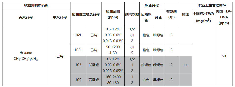 己烷检测管是一根密封的细长玻璃管,因为填充有特定的试剂和着色剂而呈现特定的颜色,当含有己烷的气体样品进入检测管后,会发生化学变化,从而引起颜色的变化。观察颜色变化的界限对应的刻度,即是被测样品中的己烷的浓度。