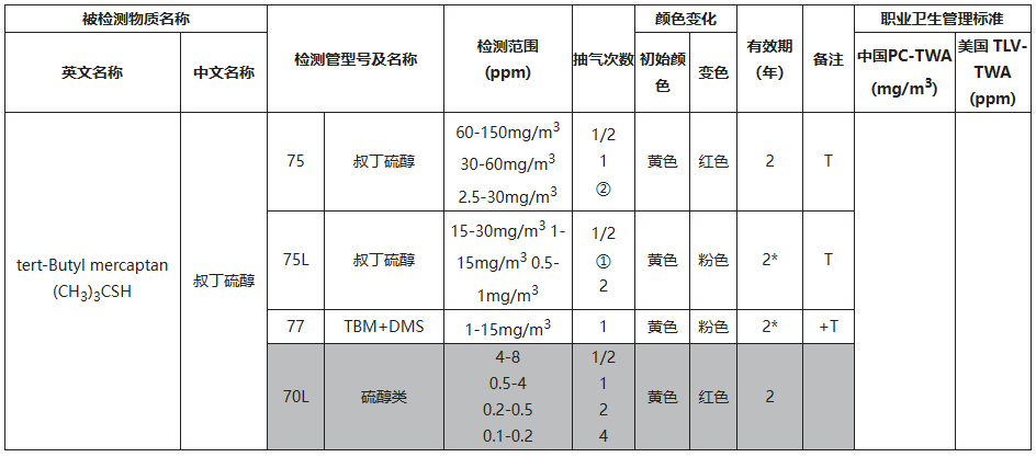 T:温度修正    H:湿度修正    +:双管    ++:9 支检测管    * :冷藏保存