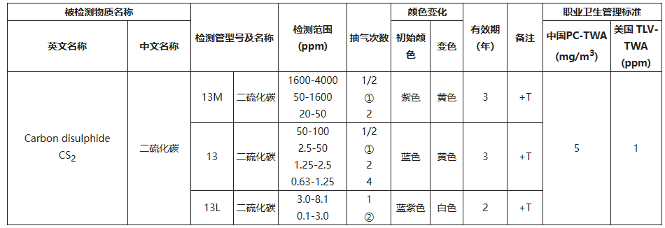 T:温度修正 H:湿度修正 +:双管 ++:9 支检测管 * :冷藏保存