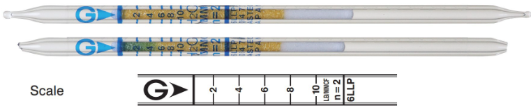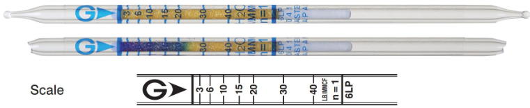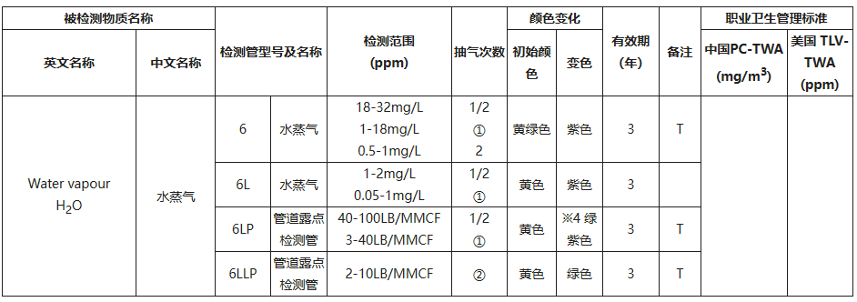 水蒸气检测管是一根密封的细长玻璃管,因为填充有特定的试剂和着色剂而呈现特定的颜色,当含有水蒸气的气体样品进入检测管后,会发生化学变化,从而引起颜色的变化。观察颜色变化的界限对应的刻度,即是被测样品中的水蒸气的浓度。